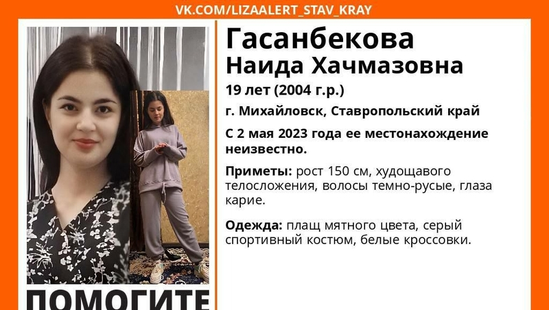 Наиде 19 лет. Рост девушки 150 см. У неё худощавое телосложение, тёмно-русые волосы и карие глаза. В момент ухода подросток была одета в плащ мятного цвета, серый спортивный костюм и белые кроссовки.